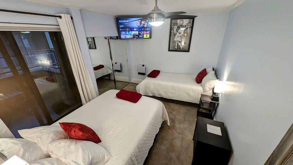 Fitted with a queen and twin, both Purple 4 mattresses. Comfortably sleep 3, with a ceiling fan and a 50″ smart TV. Has a sliding glass door to access the back patio. You will certainly get a great night’s rest in our Park city condo rental.