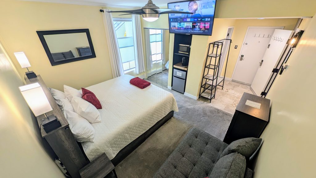 A king bed with a Purple 4 mattress, chaise lounge couch, fridge/freezer, microwave, ceiling fan, 55″ TV and your own private bathroom. enjoy privacy and comfort in our Park City Condo Rental.