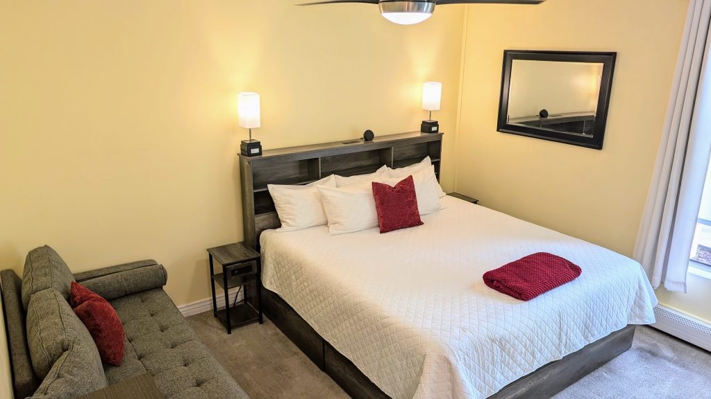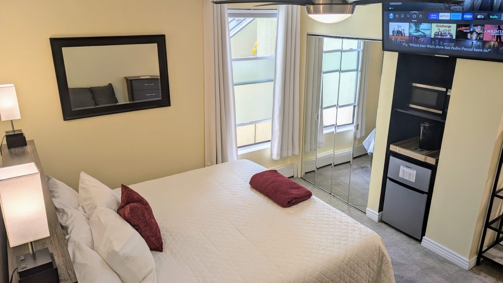 This room is like its own private hotel room. It has a king size Purple 4 mattress, mini fridge/freezer, microwave, Keurig style coffee maker, ceiling fan, and a 55″ TV. Just like the other TVs, it has your normal cable channels, along with Netflix, Hulu, Disney+ and Prime (for use with your sign-in)